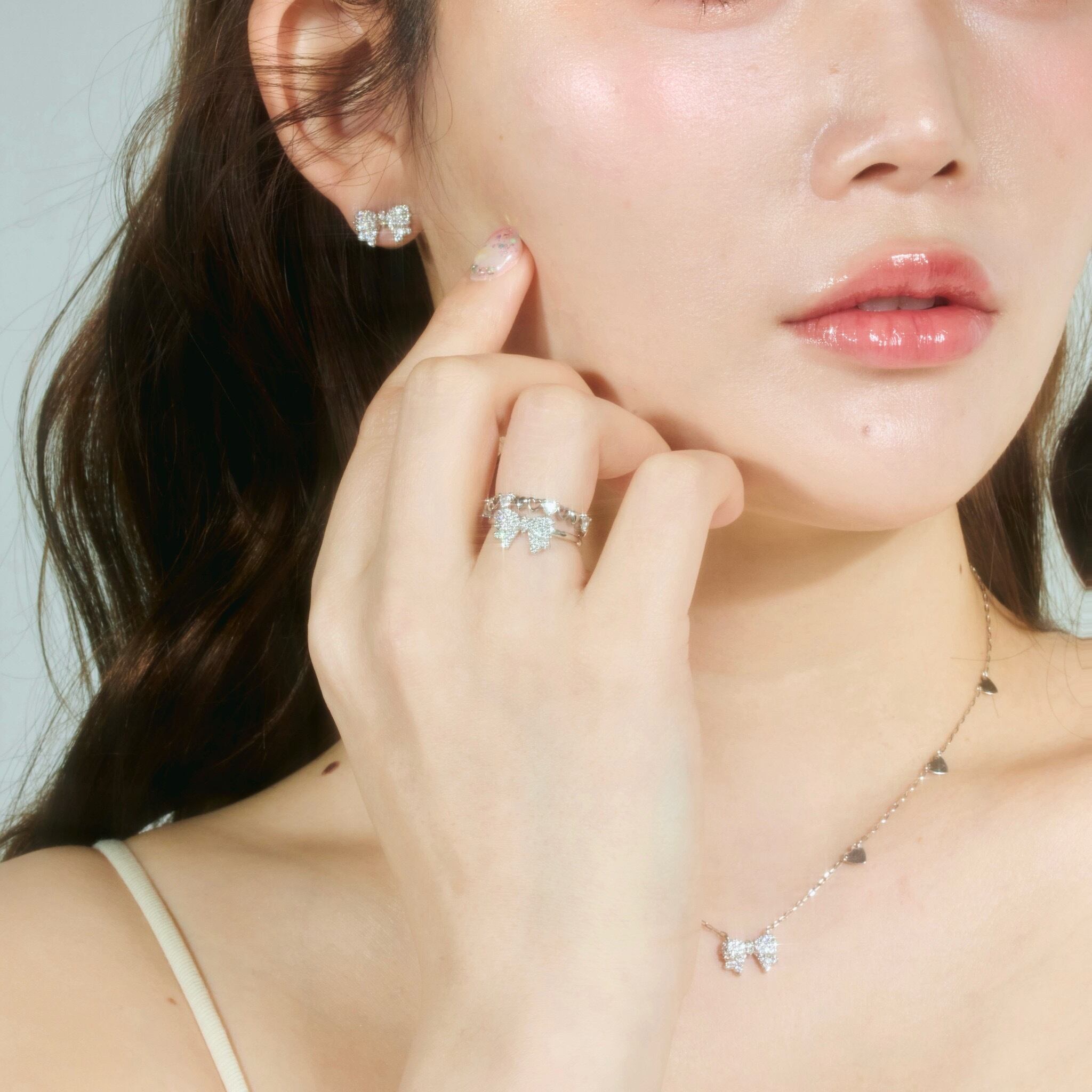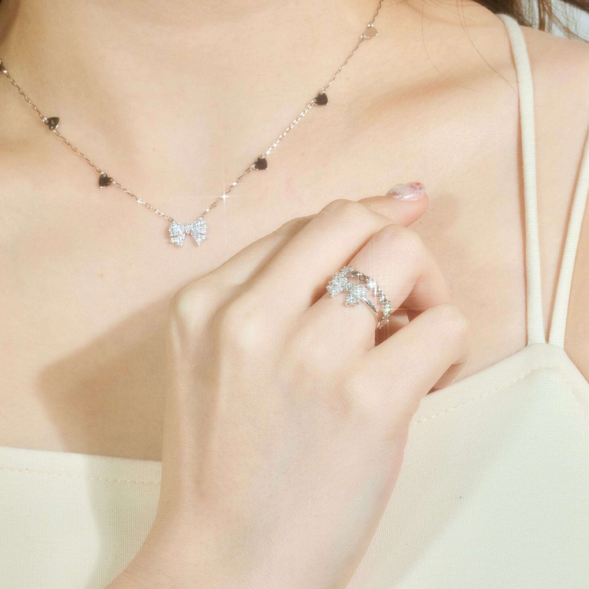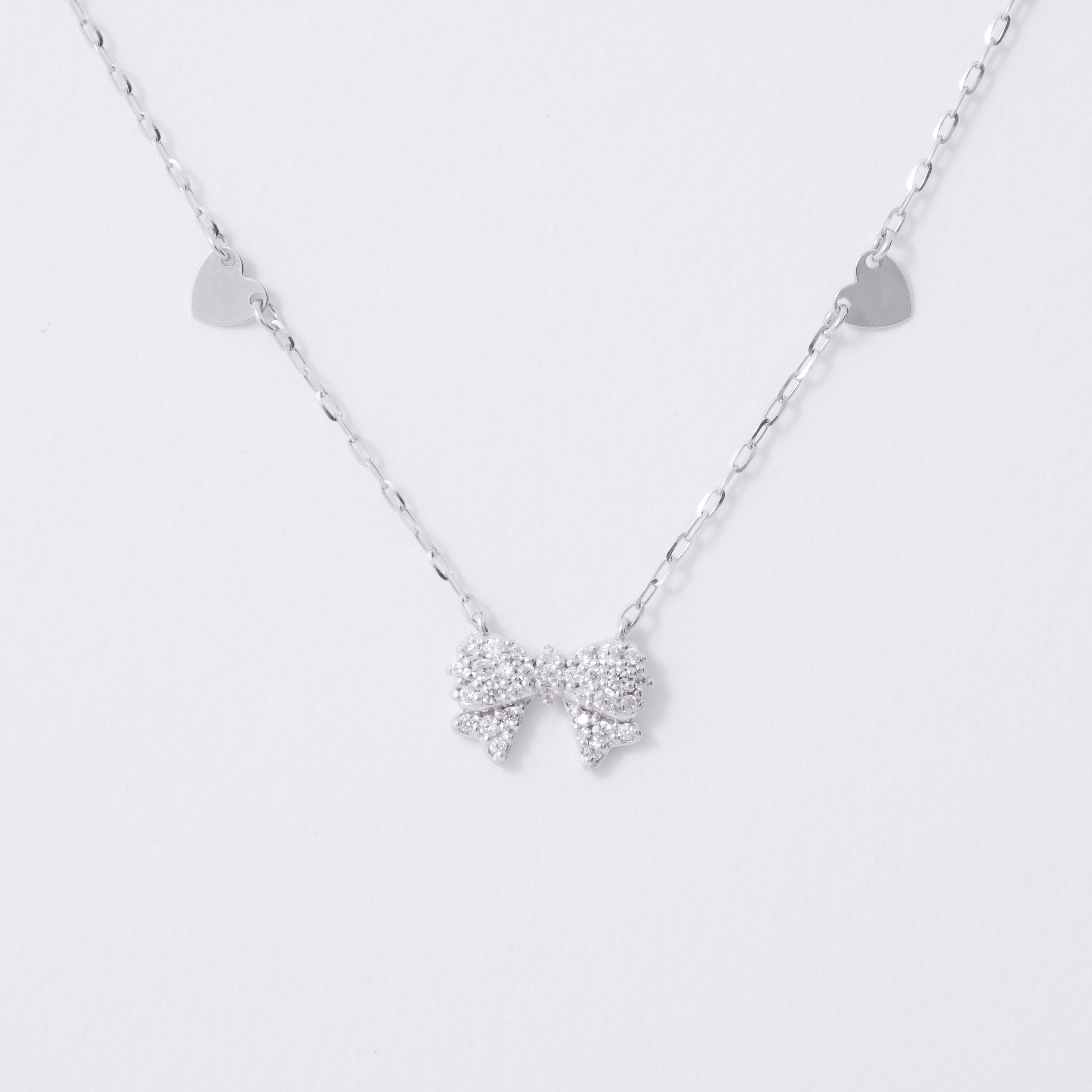 モチーフのリボンには沢山のキラキラが埋め込まれています。チェーンにはハートのパーツを加えてより可愛らしいデザインに仕上げております。