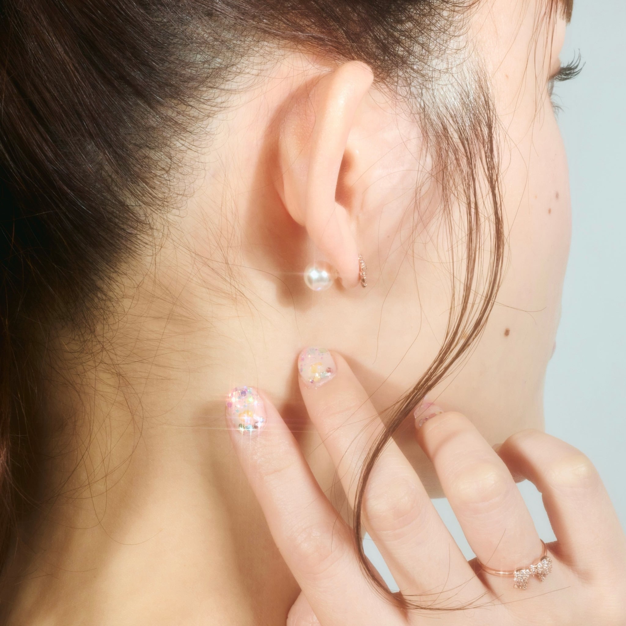 パールのキャッチのみだとモチーフが動いてしまうお客様は小さなキャッチをつけた上からパールのキャッチを付けると安定します。
