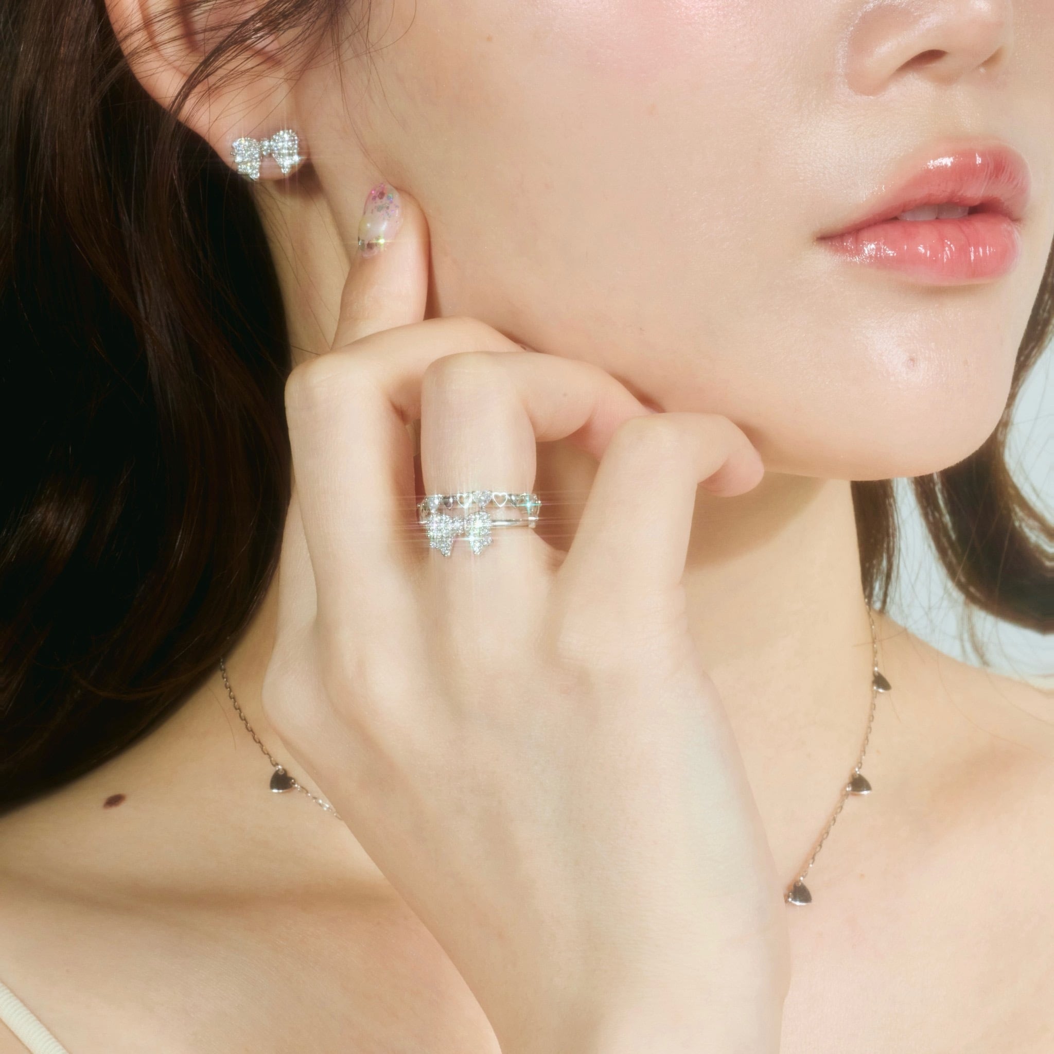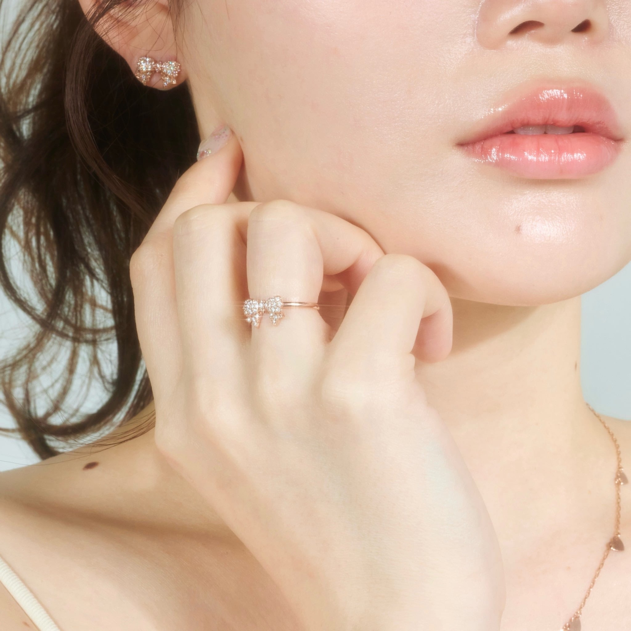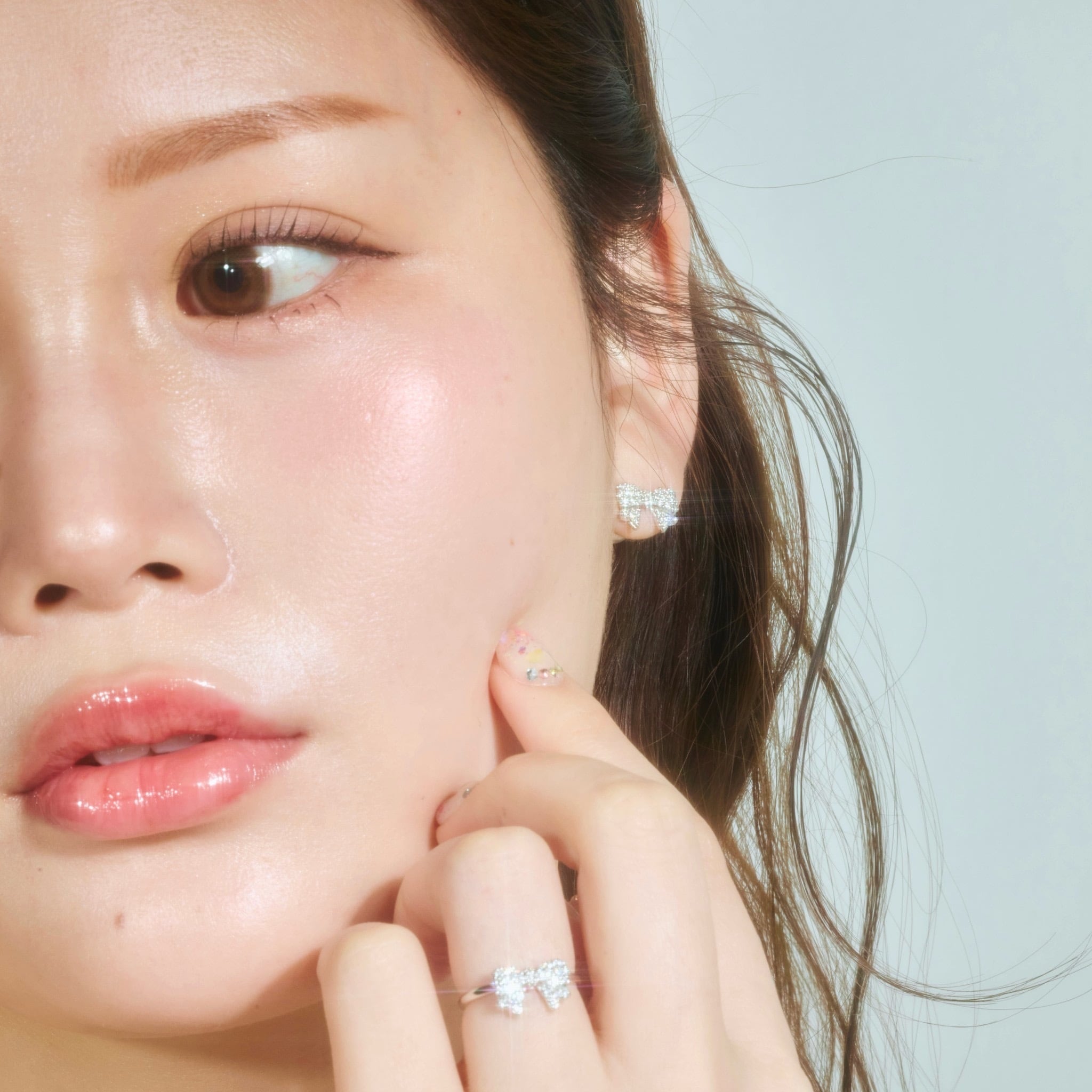 モチーフのリボンには沢山のキラキラが埋め込まれています。パールのキャッチを加えることで、裏側から見ても可愛いデザインでお作りしております。